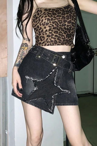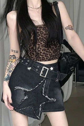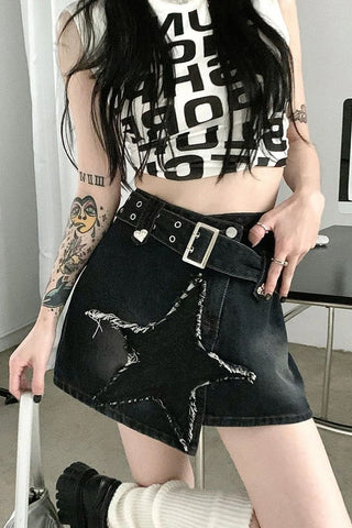 Belted Stars Pattern Embroidered Black Denim Skirts