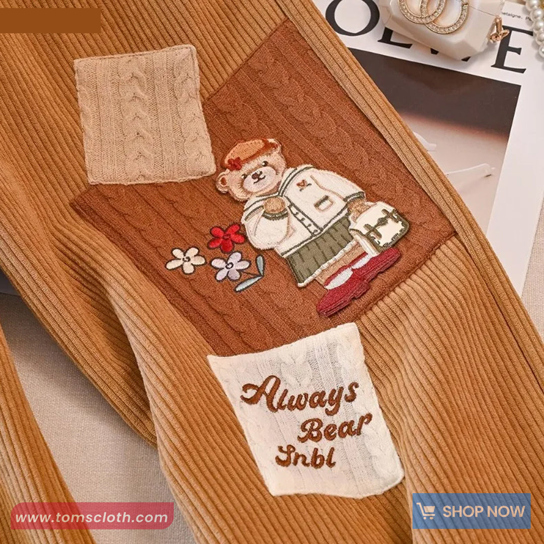 Buy Casual Cute Cartoon Bear Embroidery Corduroy Pants from Tomscloth for your outfit of the day. This item is in stock and ready to order. Enjoy 10% discount with using this code: TOMS_MANIA .