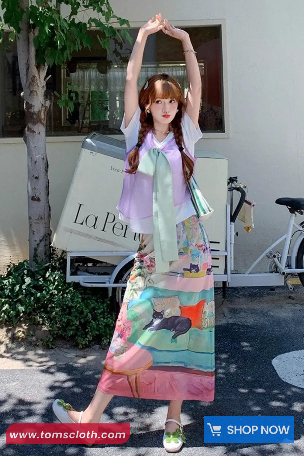 Woman sitting on a bench wearing a white t-shirt with a cat graphic and a colorful skirt, with 'www.tomscloth.com' displayed.