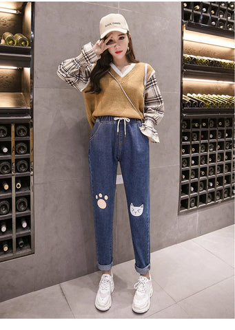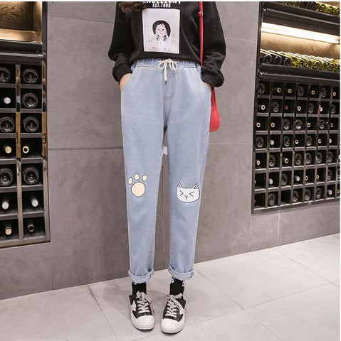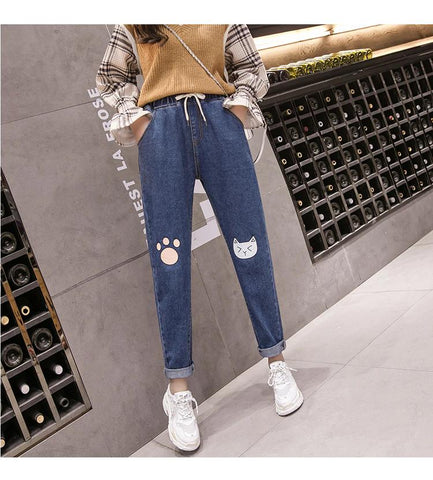 High Waist Kawaii Cat Foot Printed Jeans