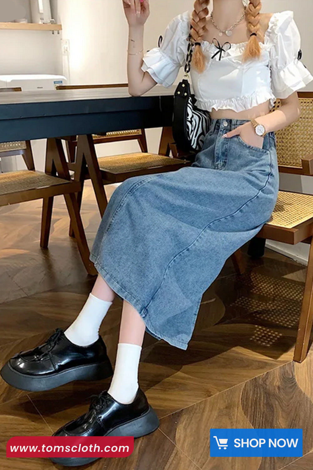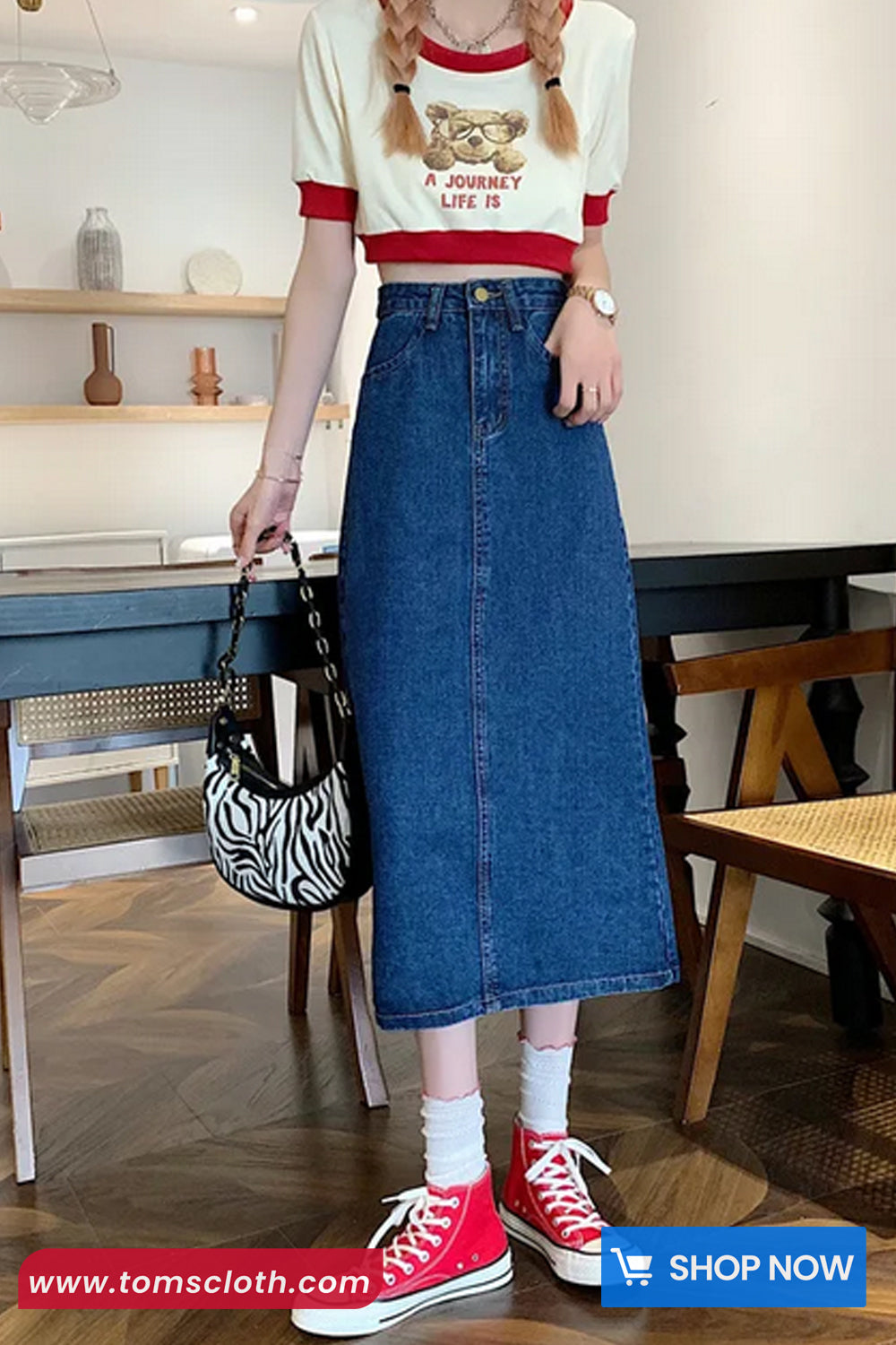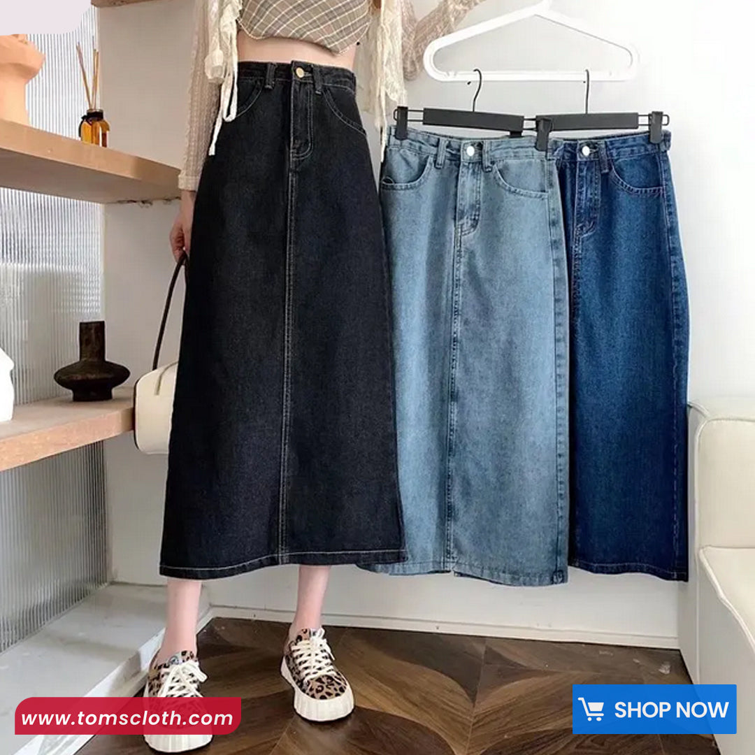 Buy High Waist Medium Length Denim Skirts from Tomscloth for your outfit of the day. This item is in stock and ready to order. Enjoy 10% discount with using this code: TOMS_MANIA .