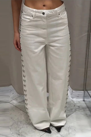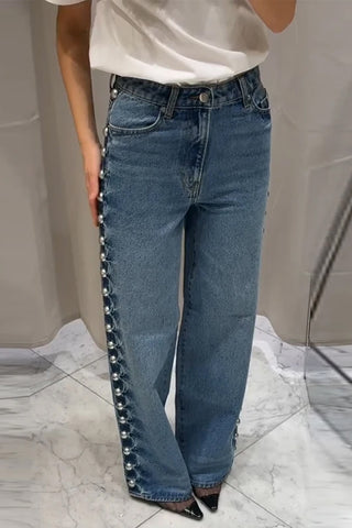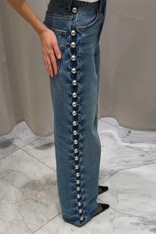 Buy High Waist Side Beading Pearls Jeans Pants from Tomscloth for your outfit of the day. This item is in stock and ready to order. Enjoy 10% discount with using this code: TOMS_MANIA .