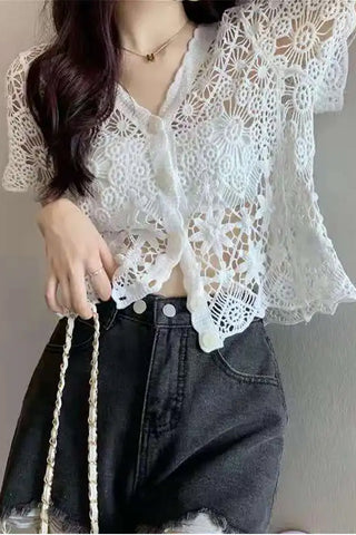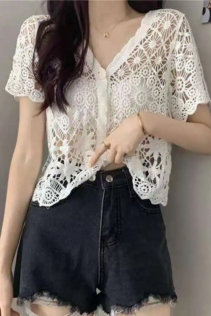 Short Sleeve V-Neck Knitted Embroidered Crochet Shirt