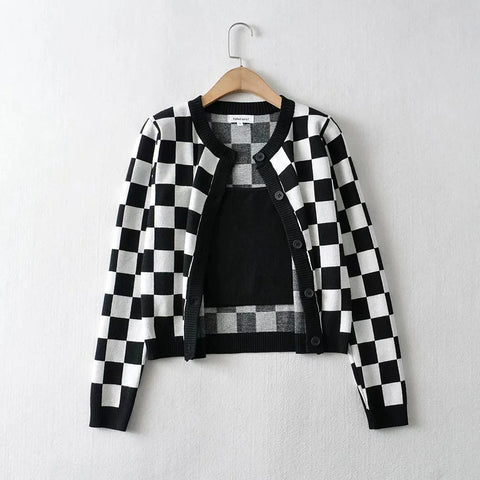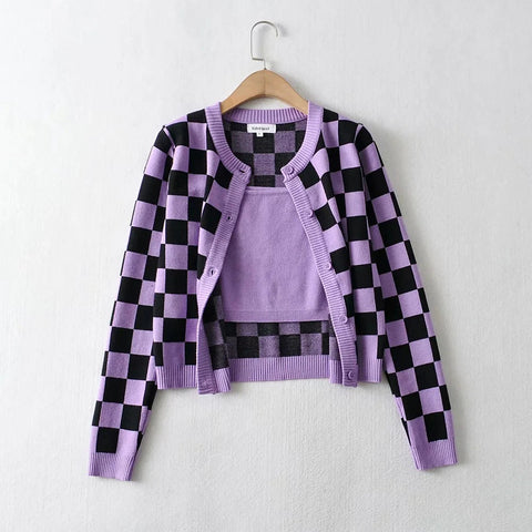 2 Pieces Set Plaid Cardigan Sweater with Camis