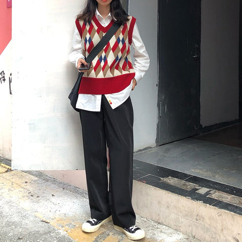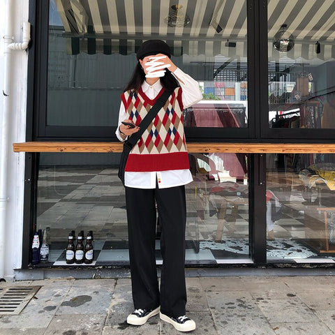 Argyle Pattern V-Neck Sleeveless Knitted Vest Sweater