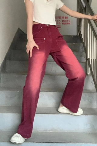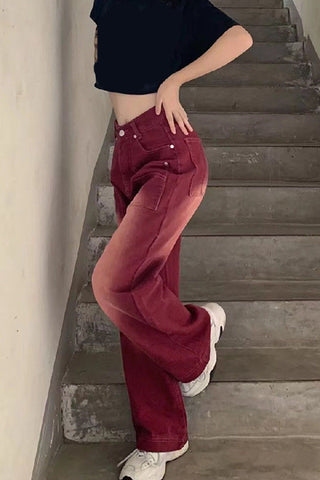 High Waist Retro Red Denim Long Pants