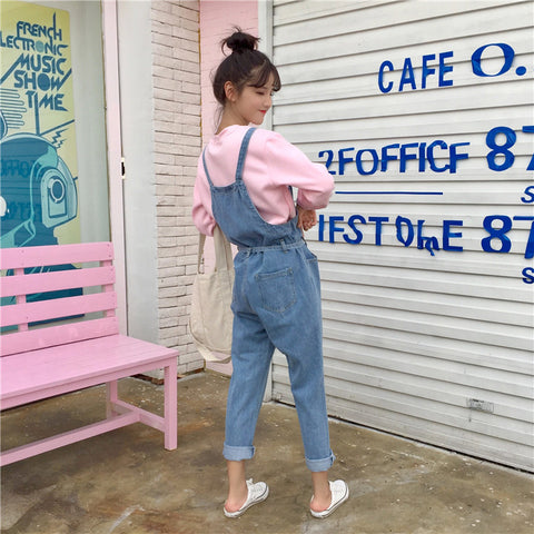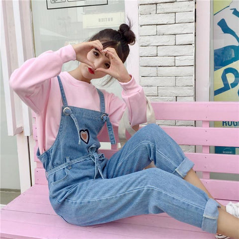 Love Embroidery Tie Belt Adjustable Denim Ankle Jumpsuit