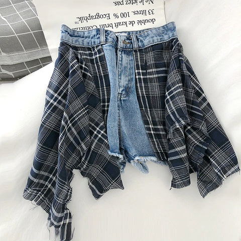 Plaid Stitching Two Style Wide Leg Denim Shorts