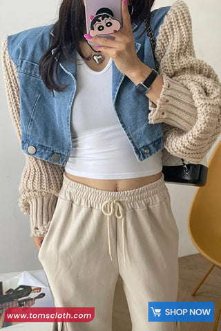 Buy Long Sleeve Denim Patchwork Retro Knitted Cropped Sweater from Tomscloth for your outfit of the day. This item is in stock and ready to order. Enjoy 10% discount with using this code: TOMS_MANIA .