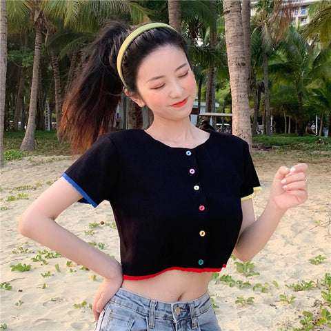 Colorful Buttons O Neck Short Sleeve Crop Top