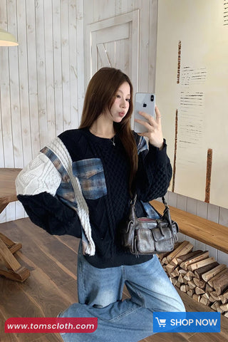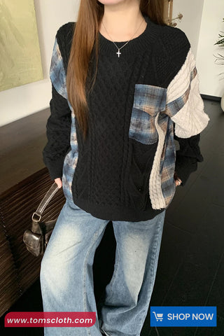 Buy Long Sleeve Plaid Patchwork Knitted Black Sweater from Tomscloth for your outfit of the day. This item is in stock and ready to order. Enjoy 10% discount with using this code: TOMS_MANIA .