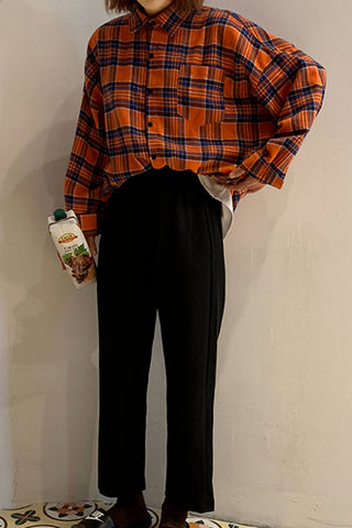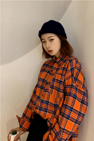 Loose Casual Orange Plaid Long Sleeve Shirt