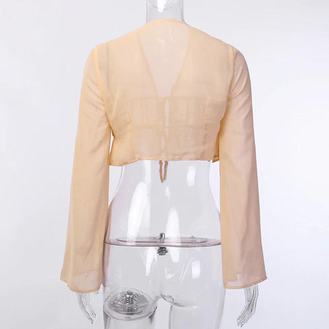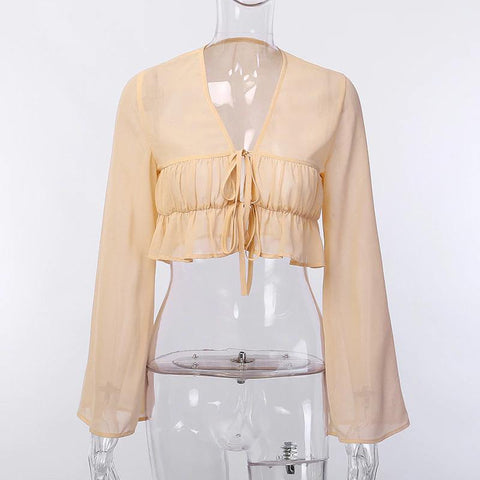 Sexy Long Sleeve Flare Ruched V-Neck Crop Top