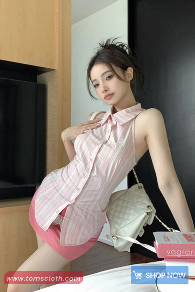 Buy Sleeveless Back Drawstring Pink Striped Blouse Shirt from Tomscloth for your outfit of the day. This item is in stock and ready to order. Enjoy 10% discount with using this code: TOMS_MANIA .