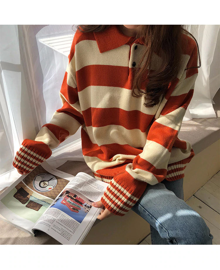 Color Stripe Casual Turn-Down Collar Knitted Sweater