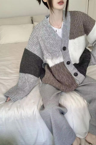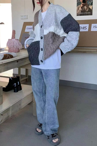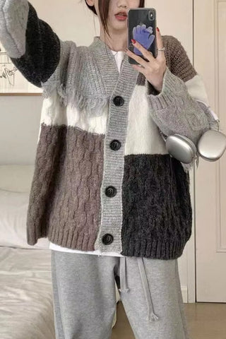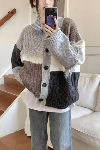 Long Sleeve Block Plaid Tassel V-Neck Cardigan Sweater