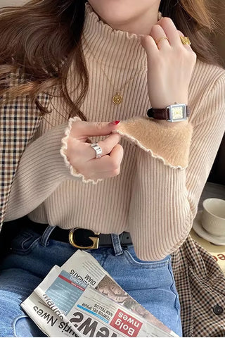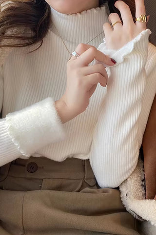 Long Sleeve Mock Neck Ruffled Slim Knitted Sweater