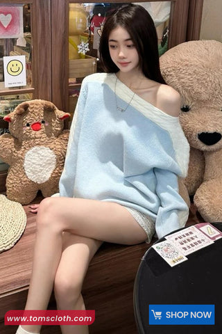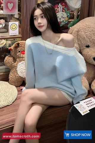 Buy Long Sleeve Off Shoulder Knitted Blue Sweater from Tomscloth for your outfit of the day. This item is in stock and ready to order. Enjoy 10% discount with using this code: TOMS_MANIA .