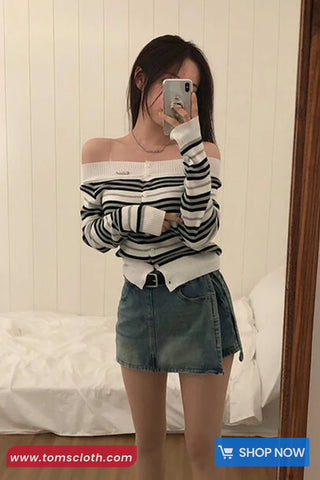 Buy Long Sleeve Sexy Cropped Slash Neck Striped Sweater from Tomscloth for your outfit of the day. This item is in stock and ready to order. Enjoy 10% discount with using this code: TOMS_MANIA .
