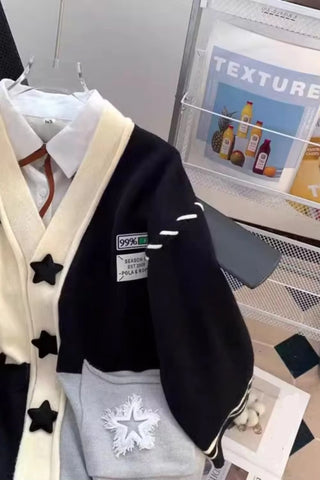 Long Sleeve Stars Pattern Two Colors Combination Cardigan Sweater