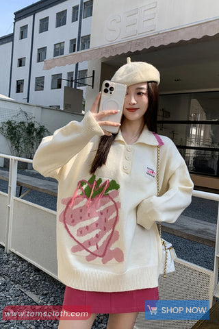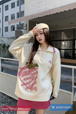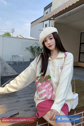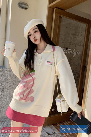 Buy Long Sleeve Turn Down Collar Strawberry Pattern Sweater from Tomscloth for your outfit of the day. This item is in stock and ready to order. Enjoy 10% discount with using this code: TOMS_MANIA .