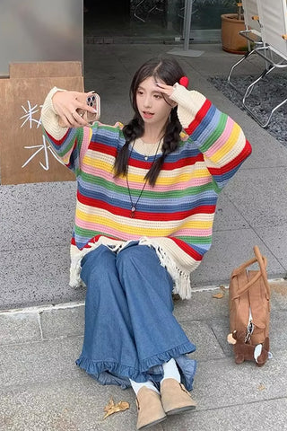 Buy O-Neck Rainbow Striped Tassel Sweater from Tomscloth for your outfit of the day. This item is in stock and ready to order. Enjoy 10% discount with using this code: TOMS_MANIA .