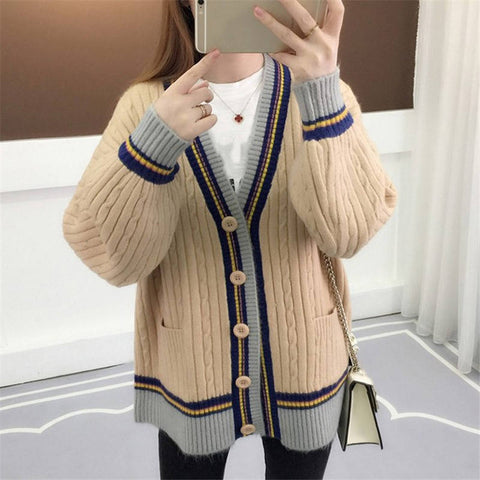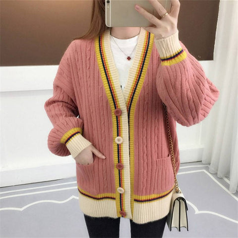 Knitted Cardigan Contrast Color V-Neck