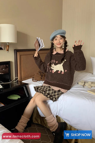 Buy Long Sleeve Cute Cat Cartoon Knitted Cropped Sweater from Tomscloth for your outfit of the day. This item is in stock and ready to order. Enjoy 10% discount with using this code: TOMS_MANIA .