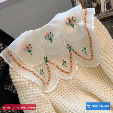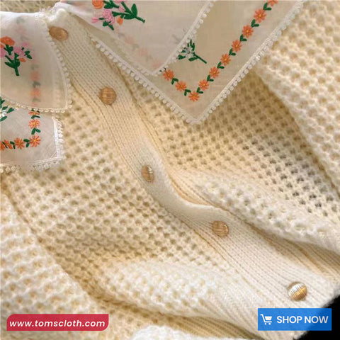Buy Long Sleeve Peter Pan Collar Floral Embroidered Knitted Sweater from Tomscloth for your outfit of the day. This item is in stock and ready to order. Enjoy 10% discount with using this code: TOMS_MANIA .