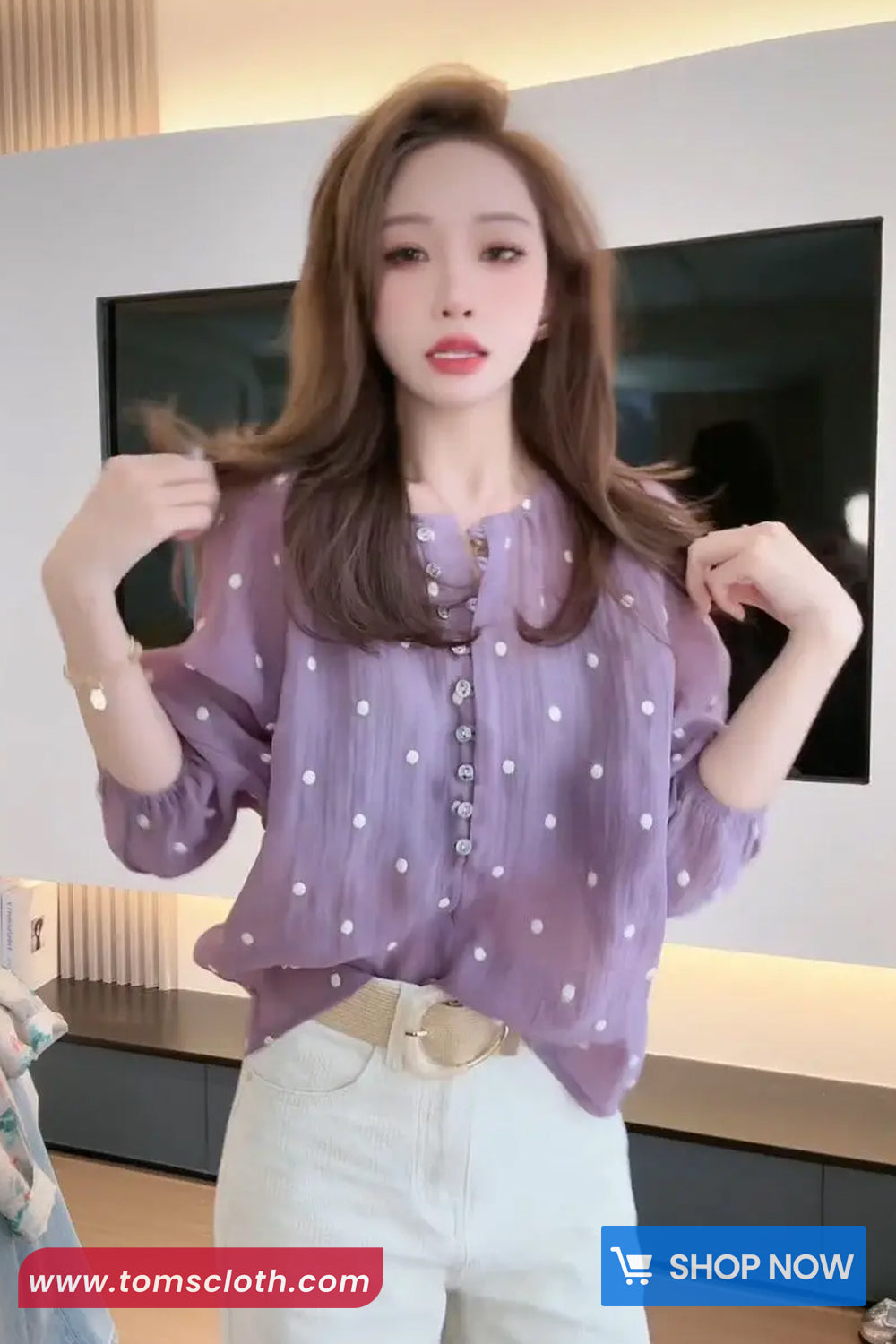 Buy Long Sleeve Polka Dots Pattern Purple Chiffon Blouse Shirt from Tomscloth for your outfit of the day. This item is in stock and ready to order. Enjoy 10% discount with using this code: TOMS_MANIA .