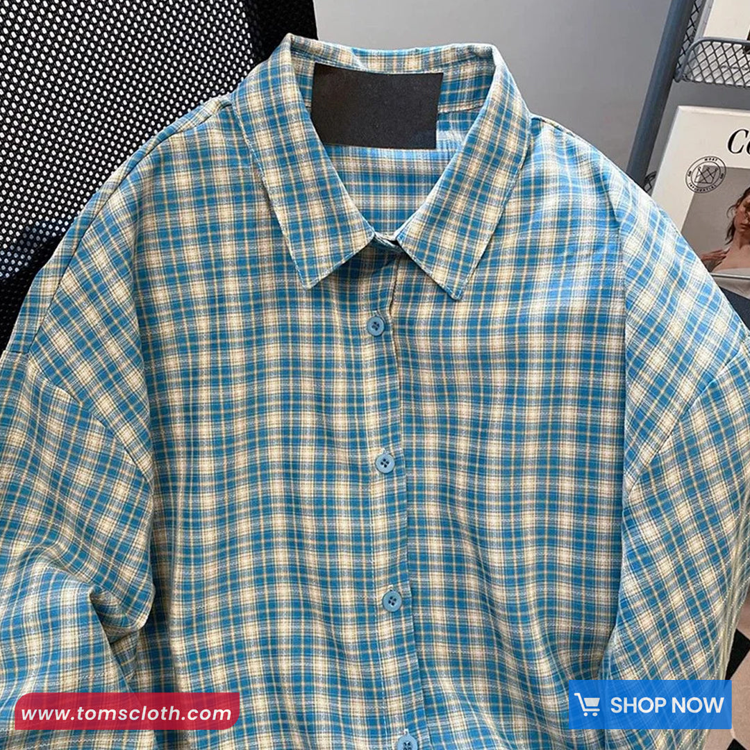 Long Sleeve Retro Blue Plaid Blouse Shirt – Tomscloth