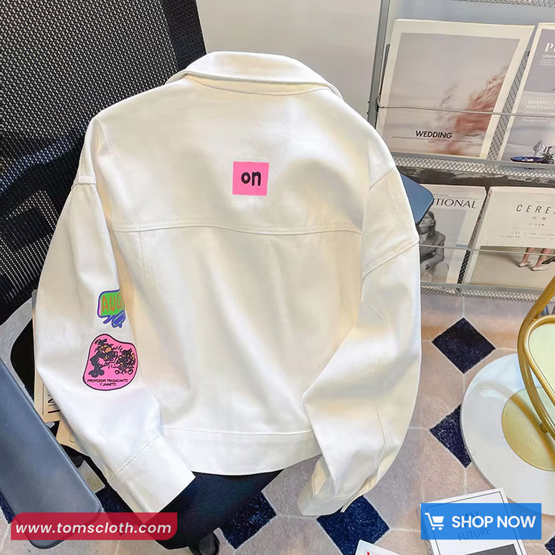 Long Sleeve Retro Graffiti Pattern White Denim Jacket – Tomscloth
