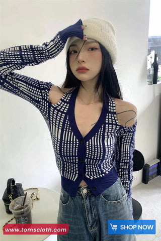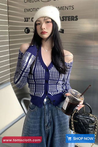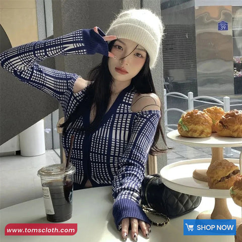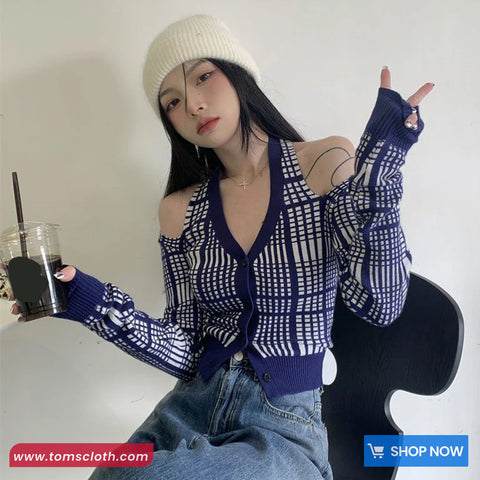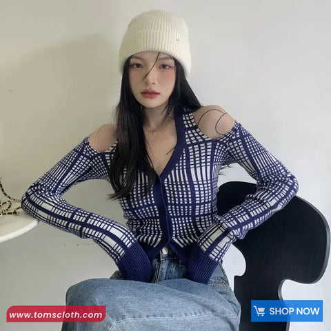 Buy Long Sleeve Sexy Off Shoulder Blue Plaid Knitted Shirt from Tomscloth for your outfit of the day. This item is in stock and ready to order. Enjoy 10% discount with using this code: TOMS_MANIA .