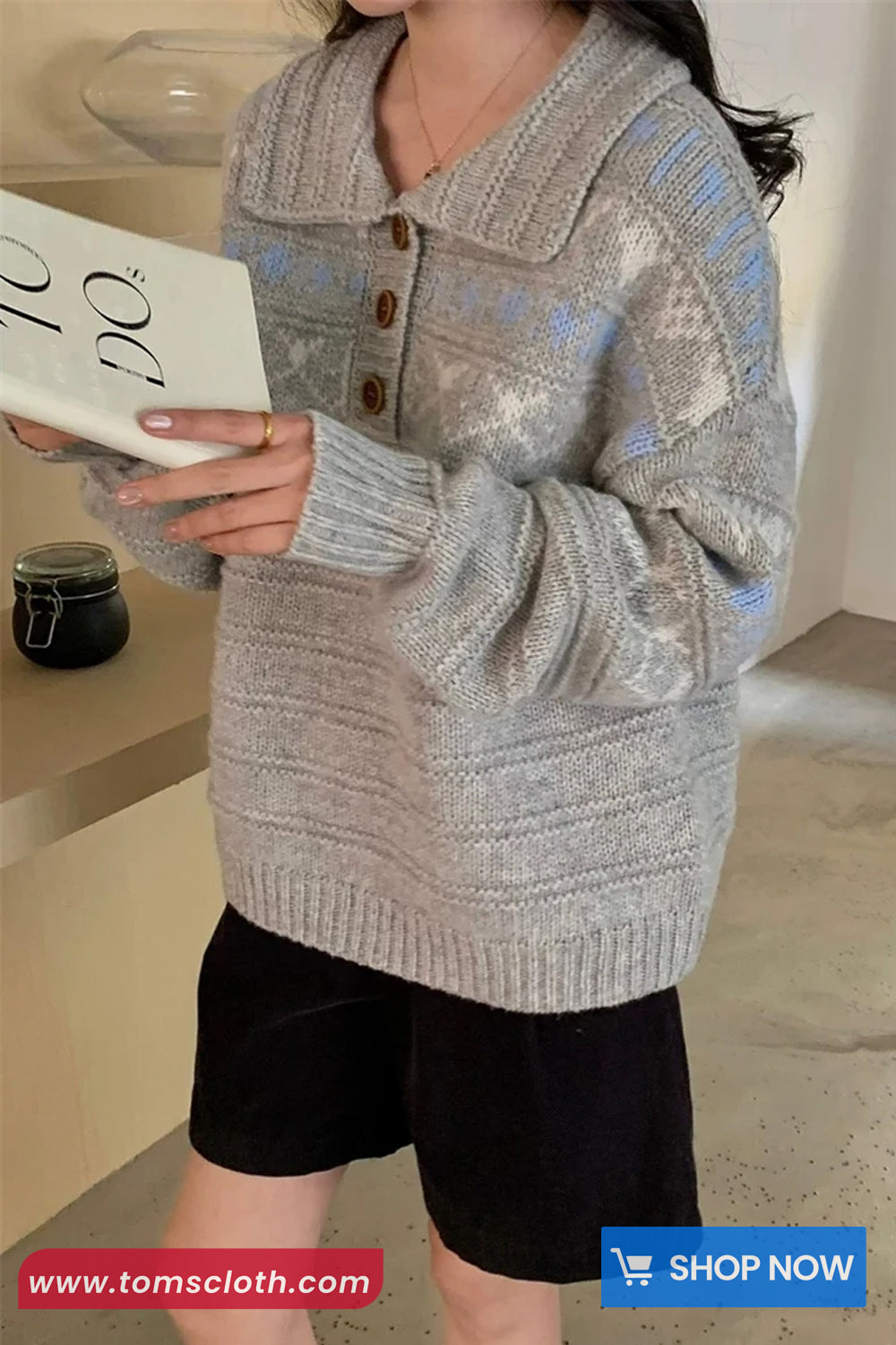 Long Sleeve Vintage Turn Down Collar Knitted Sweater – Tomscloth
