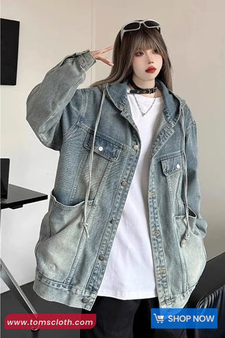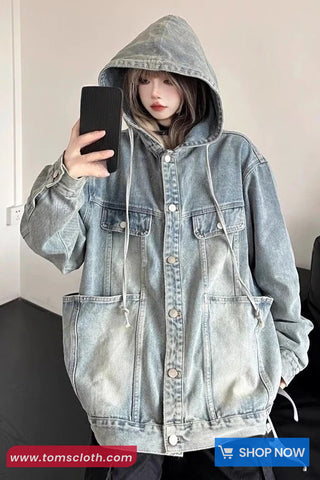 Buy Loose Vintage Retro Hooded Denim Jacket from Tomscloth for your outfit of the day. This item is in stock and ready to order. Enjoy 10% discount with using this code: TOMS_MANIA .