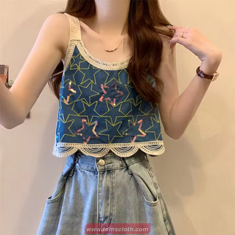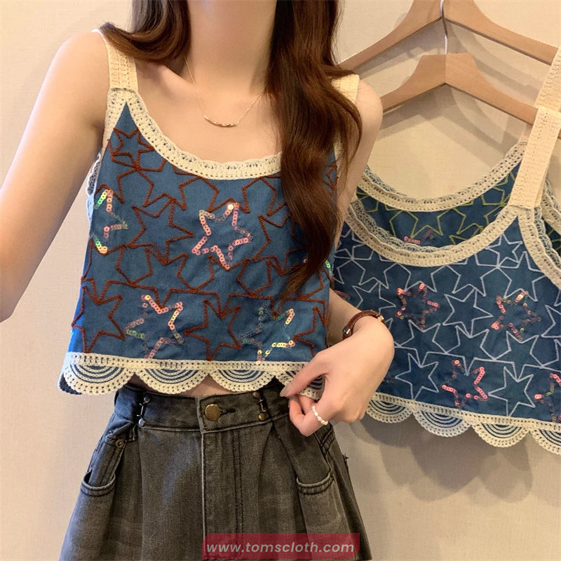 Sequined Stars Pattern Crochet Crop Tops – Tomscloth
