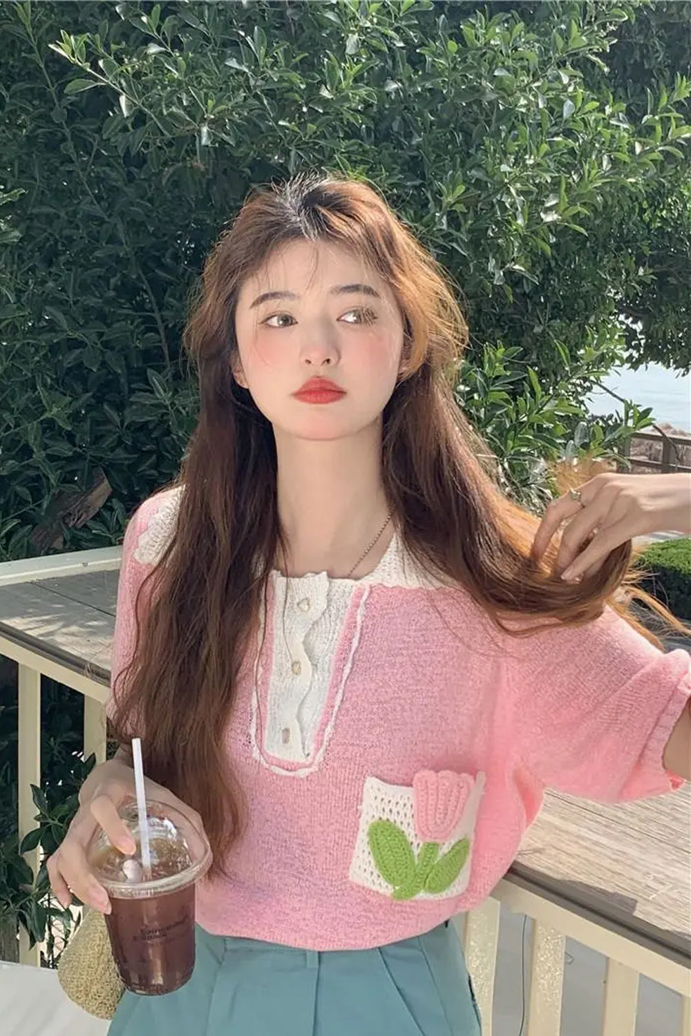 Short Sleeve Lapel Collar 3D Flower Pocket Knitted Shirt