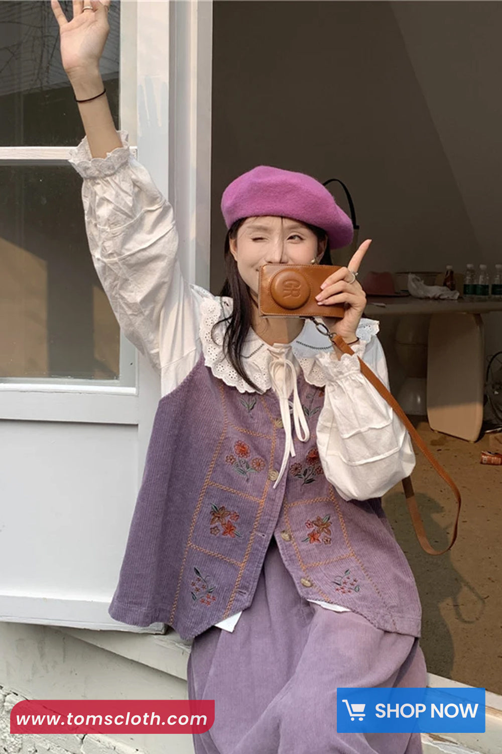 Buy Sleeveless Floral Embroidered Vest Corduroy Purple Sweater from Tomscloth for your outfit of the day. This item is in stock and ready to order. Enjoy 10% discount with using this code: TOMS_MANIA .