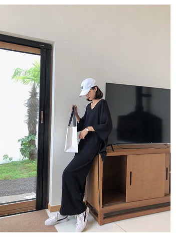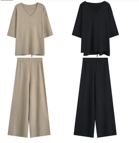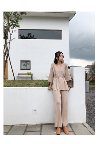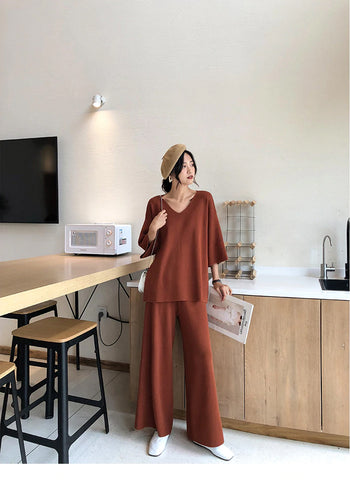 Two Piece Set Knitted Pullover V-Neck and Wide Leg Pants