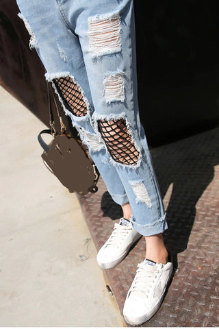 Black Fishing Net Big Hole Ripped Jeans Pants
