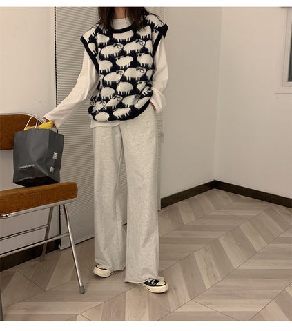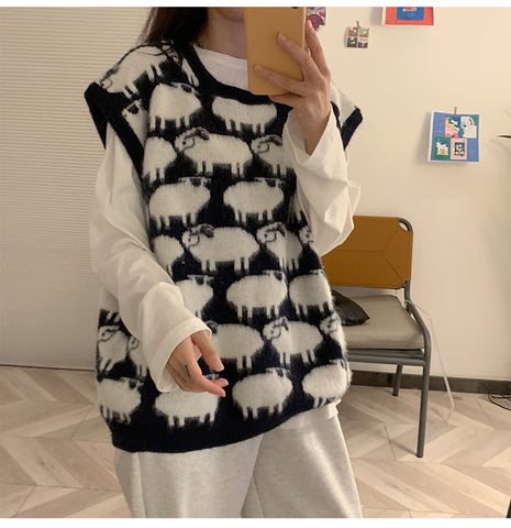 Cute Sheep Cartoon Pattern V-Neck Sleeveless Knitted Vest Sweater