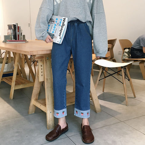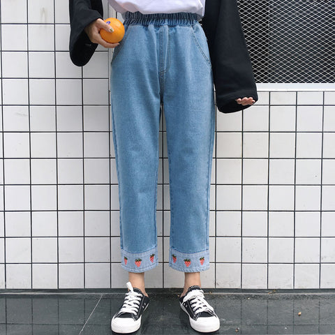 High Waist Jeans With Strawberry Embroidery