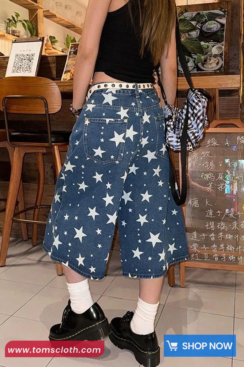 Buy Loose Full Stars Pattern Knee Length Blue Jeans Pants from Tomscloth for your outfit of the day. This item is in stock and ready to order. Enjoy 10% discount with using this code: TOMS_MANIA .