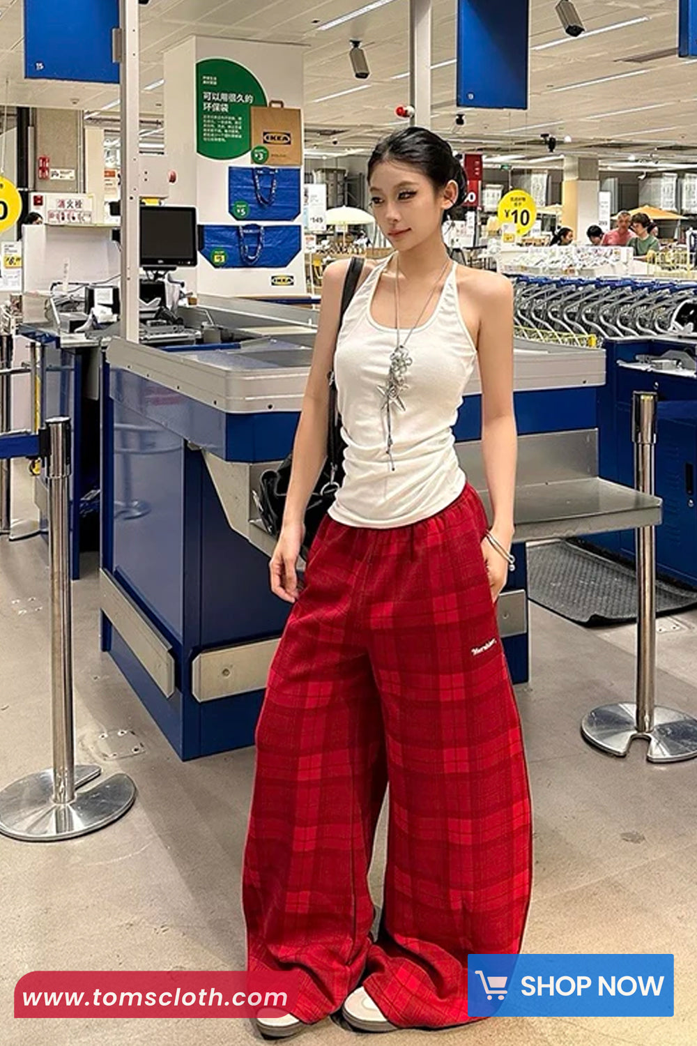 Buy Loose Wide Leg Red Plaid Women Sweatpants from Tomscloth for your outfit of the day. This item is in stock and ready to order. Enjoy 10% discount with using this code: TOMS_MANIA .